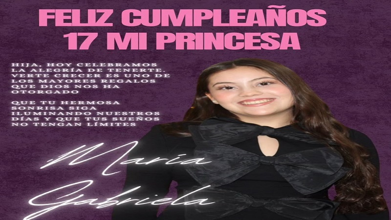 Cnel. José Manuel Suárez Maldonado Mi princesa, hoy cumples 17 años y, al mirarte, sentimos que la vida nos ha dado el privilegio más grande del mundo. Dicen que los hijos son el corazón que camina fuera del cuerpo, y en tu caso, nuestro corazón late con una fuerza y un orgullo que no caben en estas palabras.