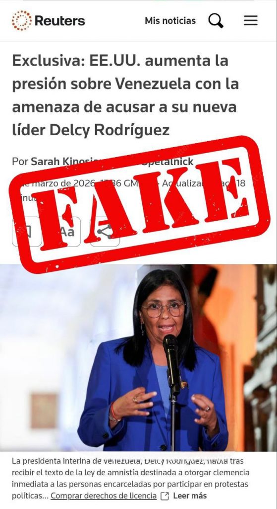 Este martes, el Gobierno Bolivariano de Venezuela desmintió categóricamente una noticia falsa (fake news) difundida por la agencia británica Reuters en contra de la Presidenta (E), Delcy Rodríguez.