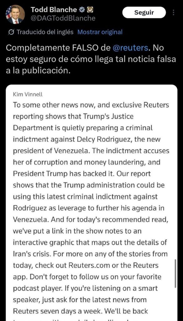 A través de la plataforma X, la cuenta oficial Miraflores Al Momento fijó posición de manera contundente para refutar la publicación. Del mismo modo, el fiscal general adjunto de Washington, Todd Blanche, desmintió a la agencia de noticias. «Es completamente falso. No estoy seguro cómo llega tal noticia falsa a la publicación».