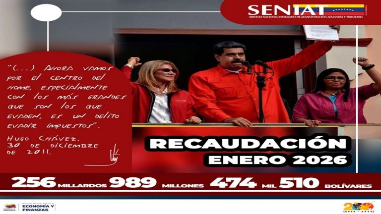 El Servicio Nacional Integrado de Administración Aduanera y Tributaria (Seniat) recaudó, durante el mes de enero del 2026, 256 millardos 989 millones 474 mil 510 bolívares.